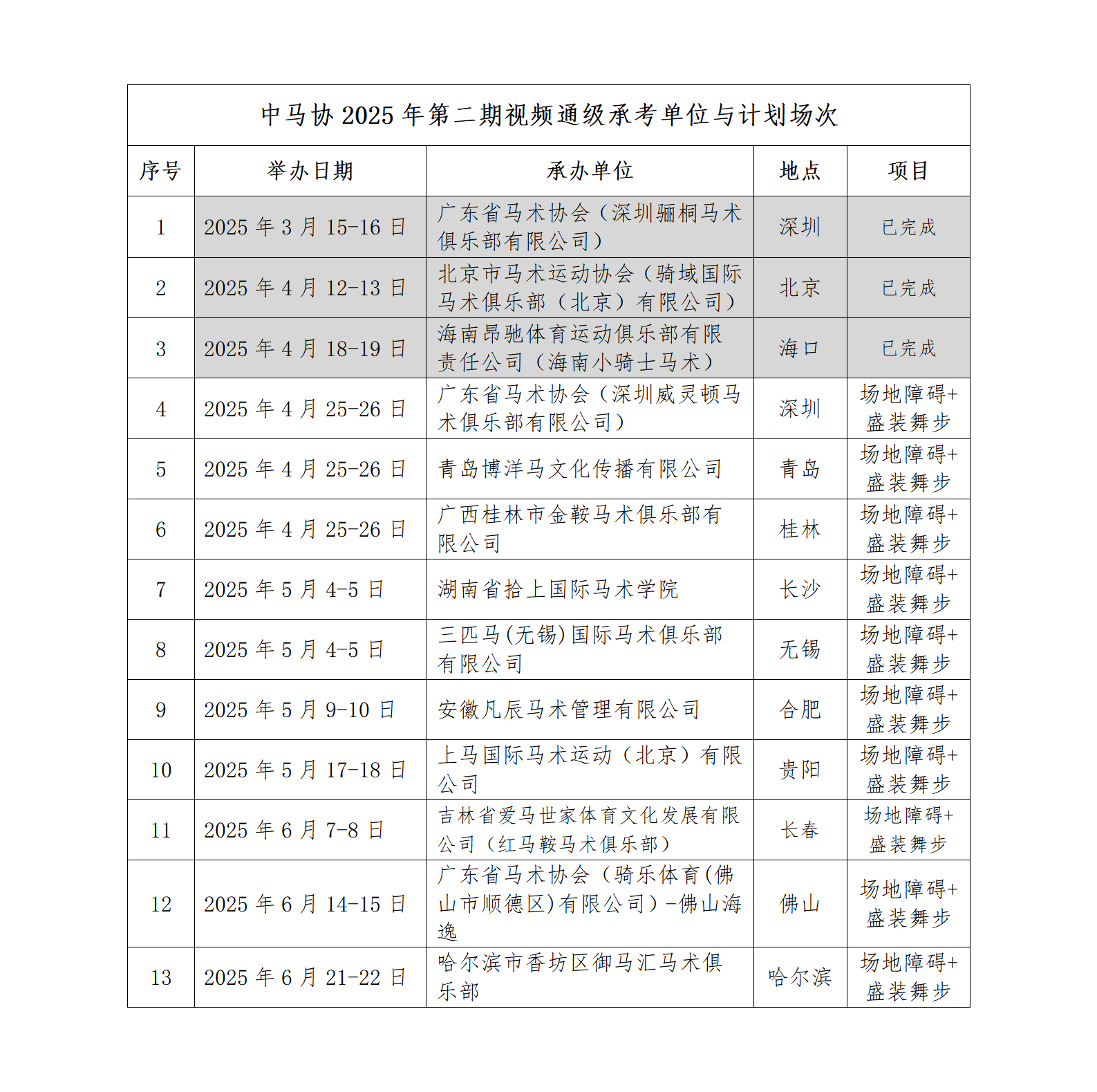 (五)在本期所有承考单位考核视频拍摄上报完成后,中国马术协会组织考官评审打分,通过考核的等级名单将在官网公示。