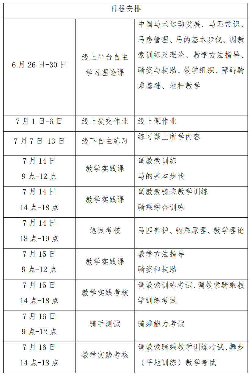 (三)线下辅导和实践考核:2025年7月14日-16日,在大连骐迹马术俱乐部进行线下集中辅导与实践考核。