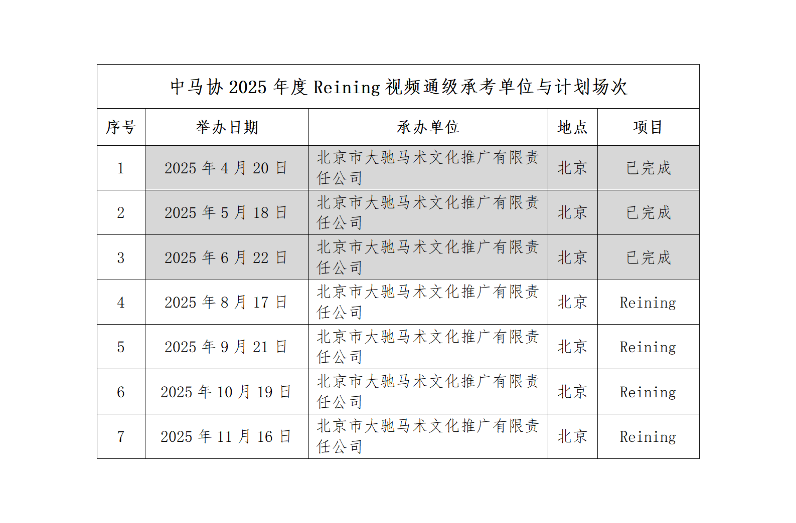 为进一步推进Reining项目通级考核工作,现将2025年度Reining项目视频通级承考单位及场次公布如下: