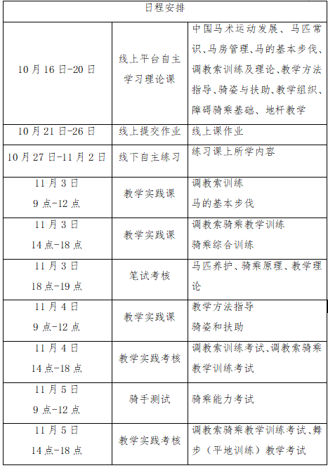 (三)线下辅导和实践考核:2025年11月3日-5日,在一朵青云马术运动中心进行线下集中辅导与实践考核。