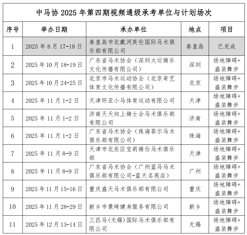 (五)在本期所有承考单位考核视频拍摄上报完成后,中国马术协会组织考官评审打分,通过考核的等级名单将在官网公示。