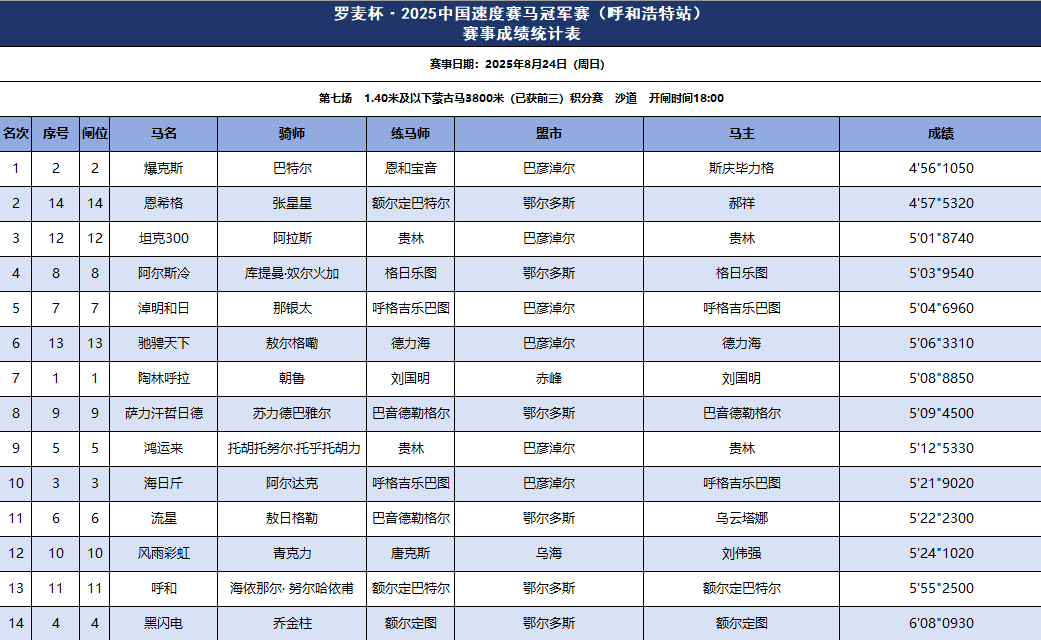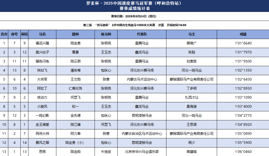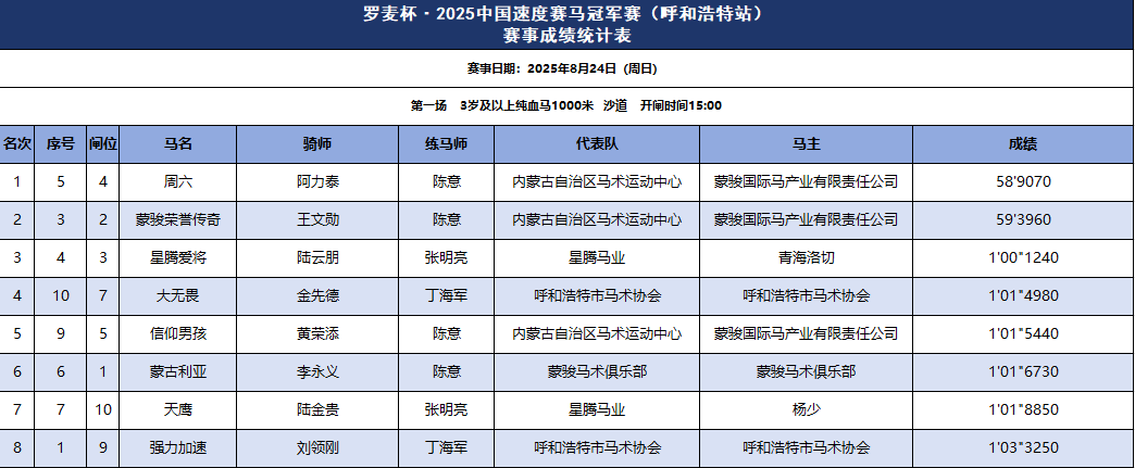 2025年8月24日,罗麦杯·2025中国速度赛马冠军赛(呼和浩特站)在内蒙古呼和浩特市少数民族群众文化体育运动中心顺利举办。各参赛马匹成绩如下: