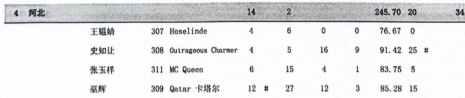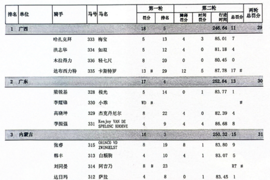 由达日玛与“萨拉”、韩丰与“白额驹”、张睿与“ORINCO VD ZWINGELST”、刘同晏与“阿吉乃”四对组合组成的内蒙古队在两轮比赛中稳踞第三名,锁定铜牌。