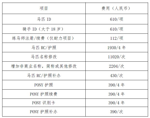 根据国际马联规定,我协会一直为其代收代缴骑手及马匹的相关注册费用,费用标准是根据国际马联发布的收费标准、相关税费及实时汇率制定的。由于国际马联收费标准变更,现我协会变更部分费用标准。明细如下: