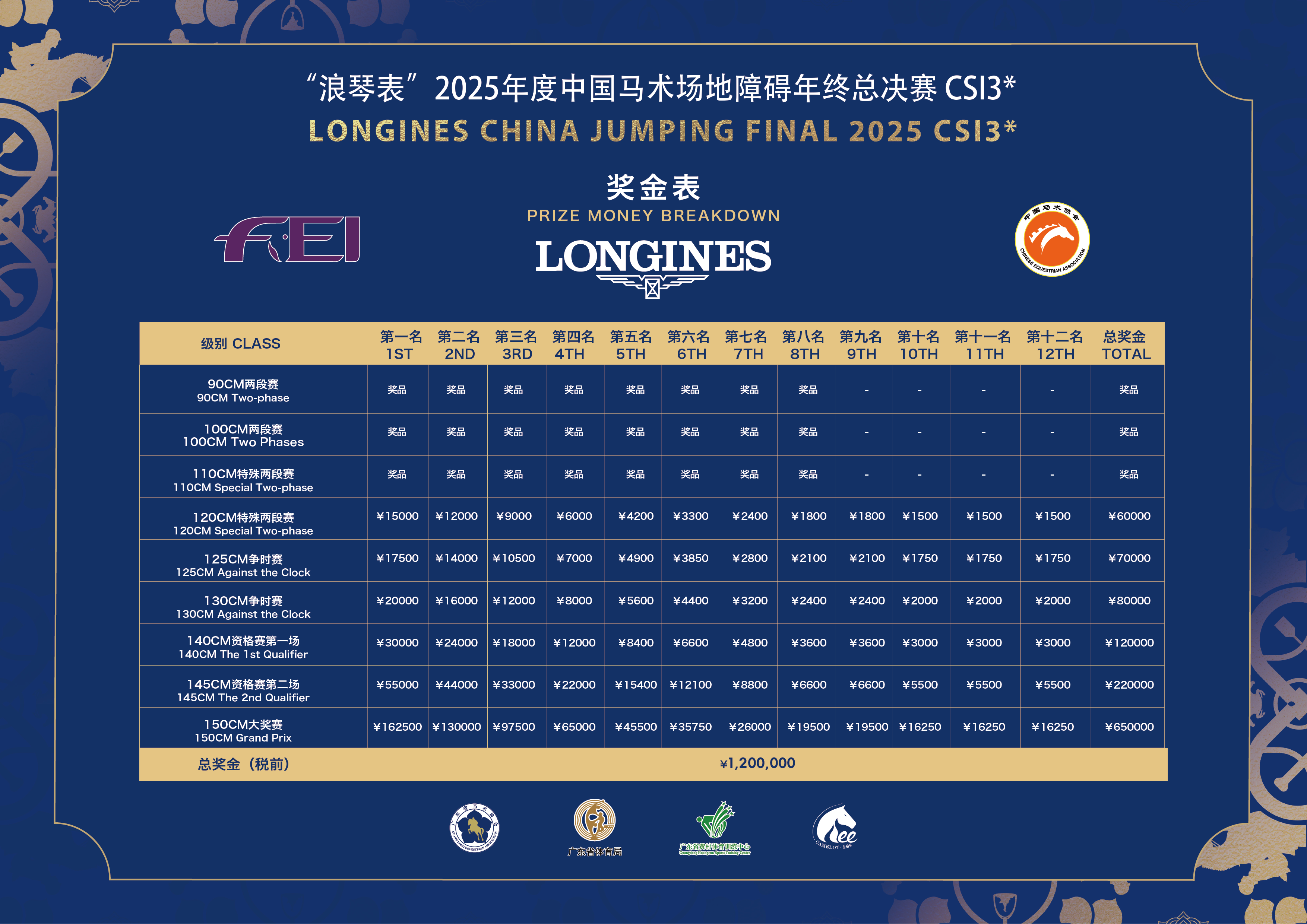 “浪琴表”2025年度中国马术场地障碍年终总决赛CSI3*将于2026年1月22日(周四)至1月25日(周日)在广东省黄村体育训练中心举办。为使比赛顺利进行,现将赛事有关事宜通知如下: