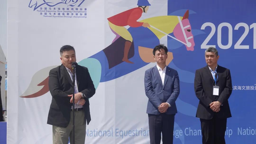 成庆书记代表中国马术协会致开幕辞,他说:“在党中央和国务院的领导下,抗击疫情取得了阶段性的胜利。此时,我们举办2021全国盛装舞步锦标赛,得到了上海市各级政府、体育局,上海金滨海文旅集团公司的大力支持和帮助。上海金山沙滩马术赛事已经走过了三年,参与过赛事的骑手们,大家都对赛事的成功举办流露出感激和怀念之情。共同期盼着金山区城市沙滩的比赛越办越好,使之能够成为像西班牙阳光海岸、美国迈阿密那样的,具有国际特色的中国沙滩马术赛事。最后,代表中国马术协会预祝参加此次赛事的各代表队人马平安,勇创佳绩。