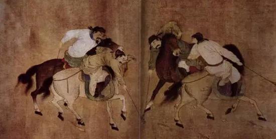 此画描绘的是球场争夺的近景场面,画面人物虽然不多,但竞争相当激烈。有探身挥杆夺球的,有握缰转身注目等候的。可谓静中有动,动中有静。这种将动与静如此和谐的搭配在一起,充分显示出画工高超的绘画技巧和独具匠心的艺术构思,给人一种古朴、典雅的美感。画中线描生动而婉转,多方折,造型传神而富有活力,人马结构准确。
