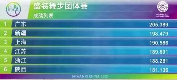 北京时间9月16日上午8:00,第十四届全运会马术项目盛装舞步团体赛(个人资格赛)在陕西省西咸新区秦汉新城马术比赛场地正式开始。经过4个多小时的角逐,最终,由黄丽兴&“爱将”、谭志勤&“斯喀拉”、顾兵&“东哥”、黄焯钦&“卡斯坦”组成的广东队以总得分205.389分摘得了第十四届全运会团体金牌,卫冕成功,由富一师&“Lady Gagga”、刘忠&“Finest Feeling”、兰超&“Sergio Leone”、刘涛&“SYLT”以198.479分组成的新疆队斩获亚军荣誉,由由吴悦&“Ooh Dear”、曹叶龙&“Detroit”、海米提·地力木热提&“RAZIDA阿斯达”、张红钊&“I DO”组成的上海队以190.586分将团体铜牌收入囊中。江苏队、浙江队和陕西队分获第十四届全运会马术项目盛装舞步团体赛第四至第六名。