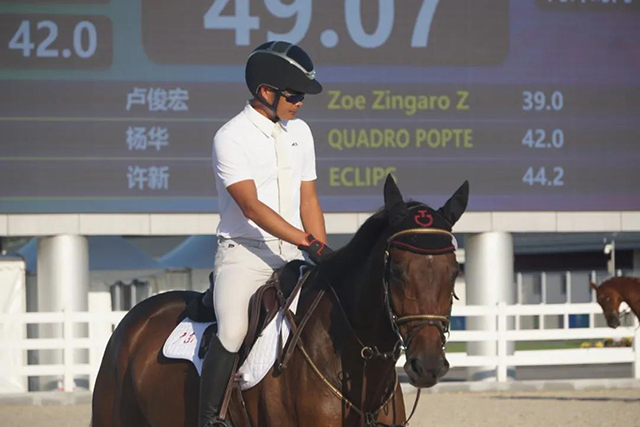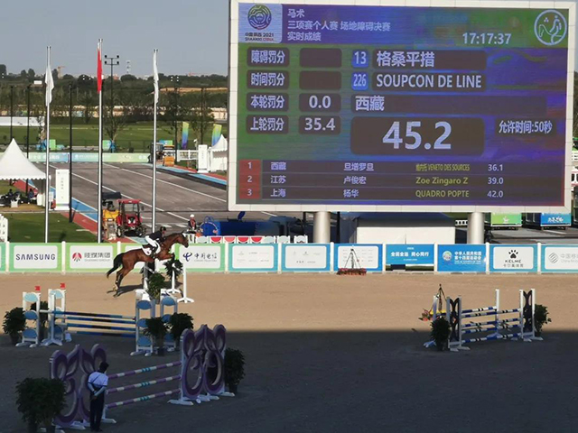 西藏队扎西,第5位出场,他和他的马匹“阿雅诺ARIANO DU QUINZE”,不幸打落一个障碍,遭遇4个罚分。最终以67.88秒,三个项目总罚分69.3分完赛。