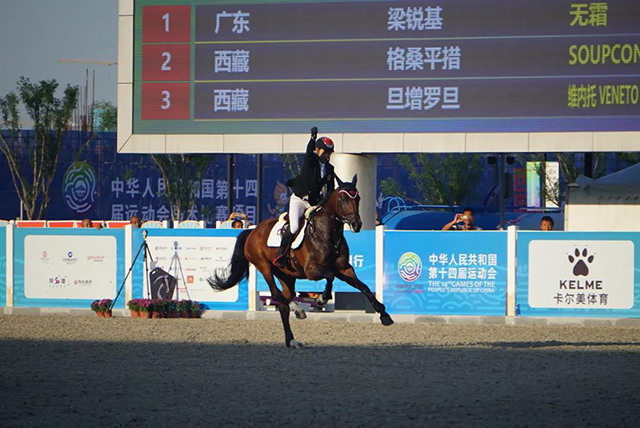 北京时间9月21日,在西咸新区秦汉新城马术比赛场地,第十四届全运会马术三项赛团体赛和个人赛决赛落下帷幕。马术三项赛团体赛由扎西、旦增罗旦、格桑平措和边巴次仁组成的西藏队以总罚分106.5分加冕冠军,由杨华、束昱颖、许新和夏伦伍组成的上海队以123.3分总罚分将亚军收入囊中,由蓝志豪、李静敏、乔仑巴特和梁锐基组成的广东队以126.4的总罚获得季军。
