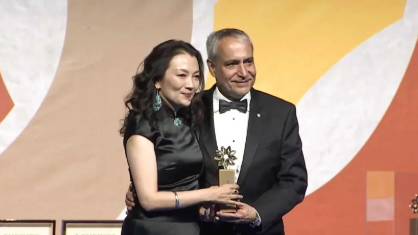 国际马联主席英格玛·德沃斯先生为天星调良马术俱乐部王蔷女士颁发同心协力奖杯