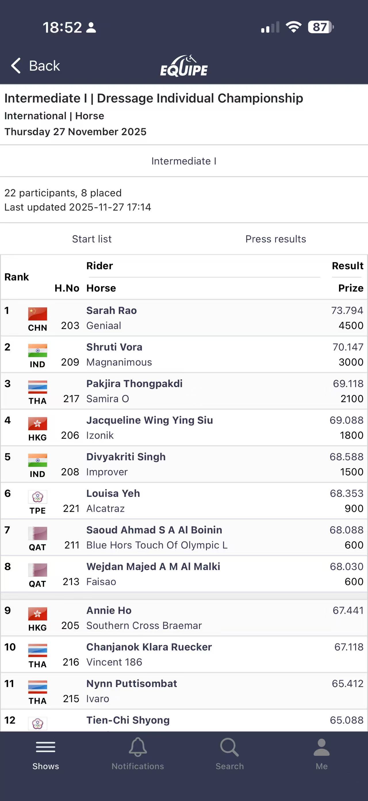 本届亚锦赛盛装舞步项目共有来自中国、中国香港、中国台北、印度、泰国、卡塔尔、巴林、阿联酋共8个国家和地区的22对人马组合参赛,其中包括中国年仅18岁的年轻骑手刘骅之,她也在本届赛事中完成了个人亚锦赛首秀。